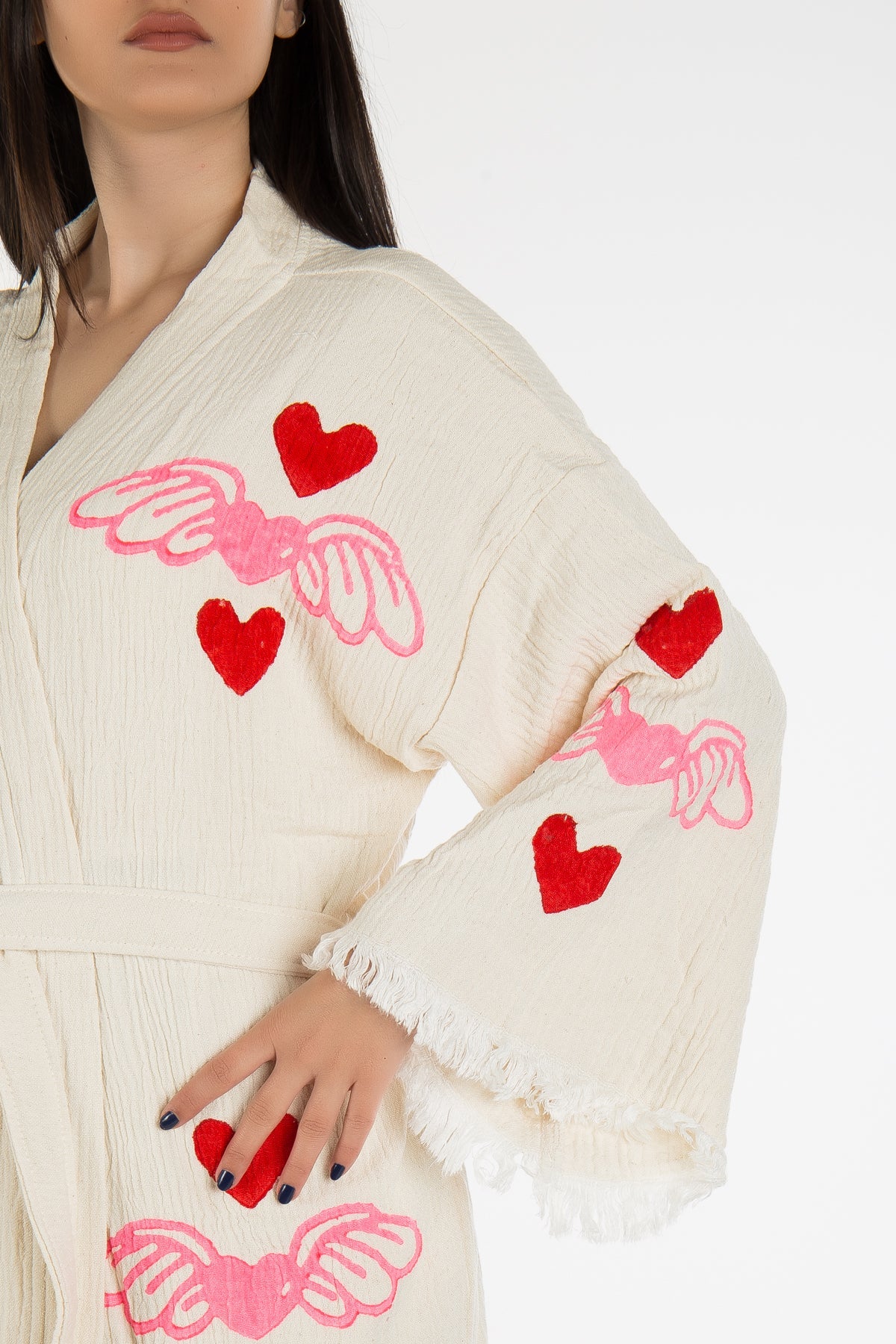 Valentine - Natural Flying Red Hearts Handmade Kimono