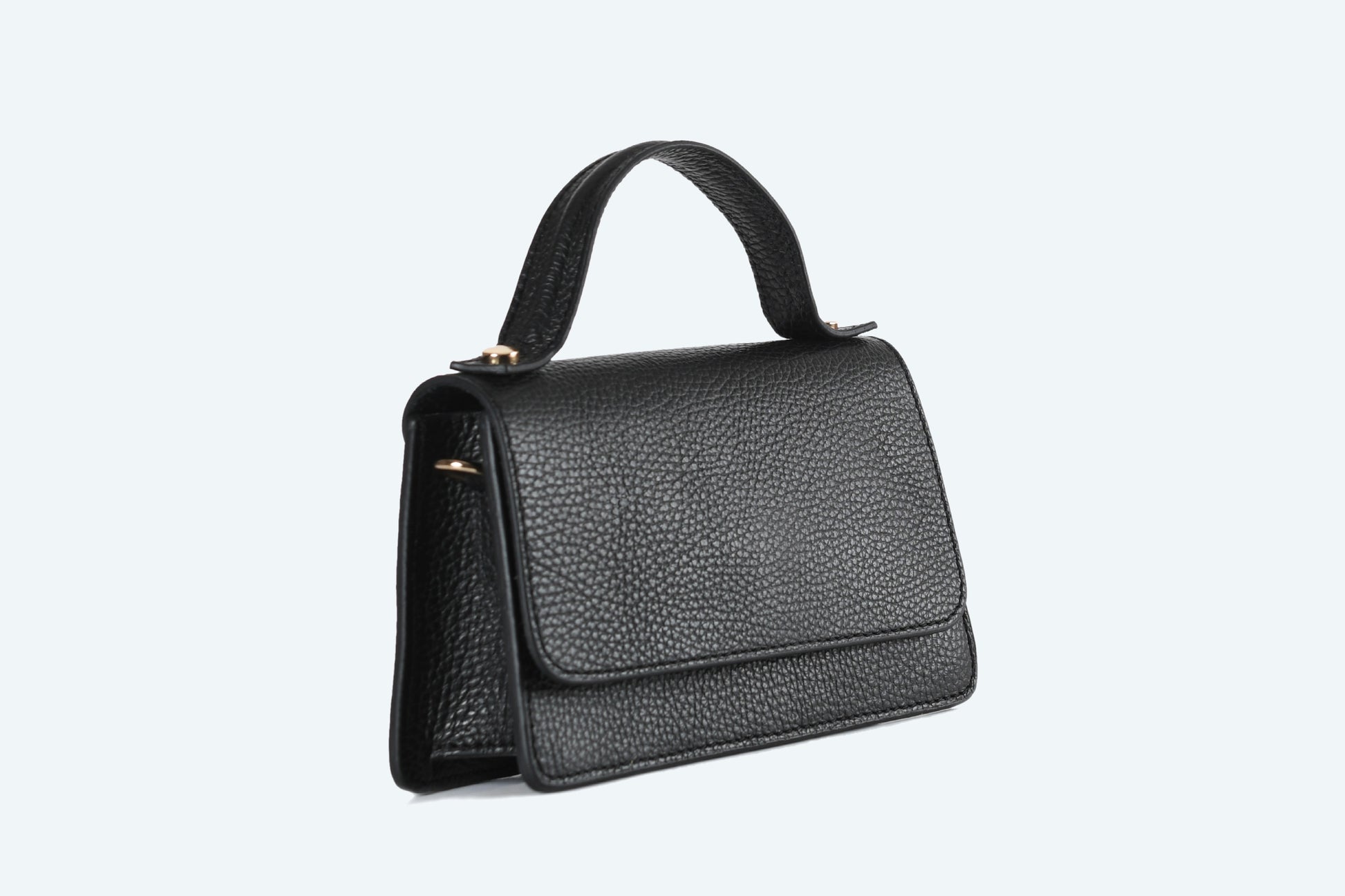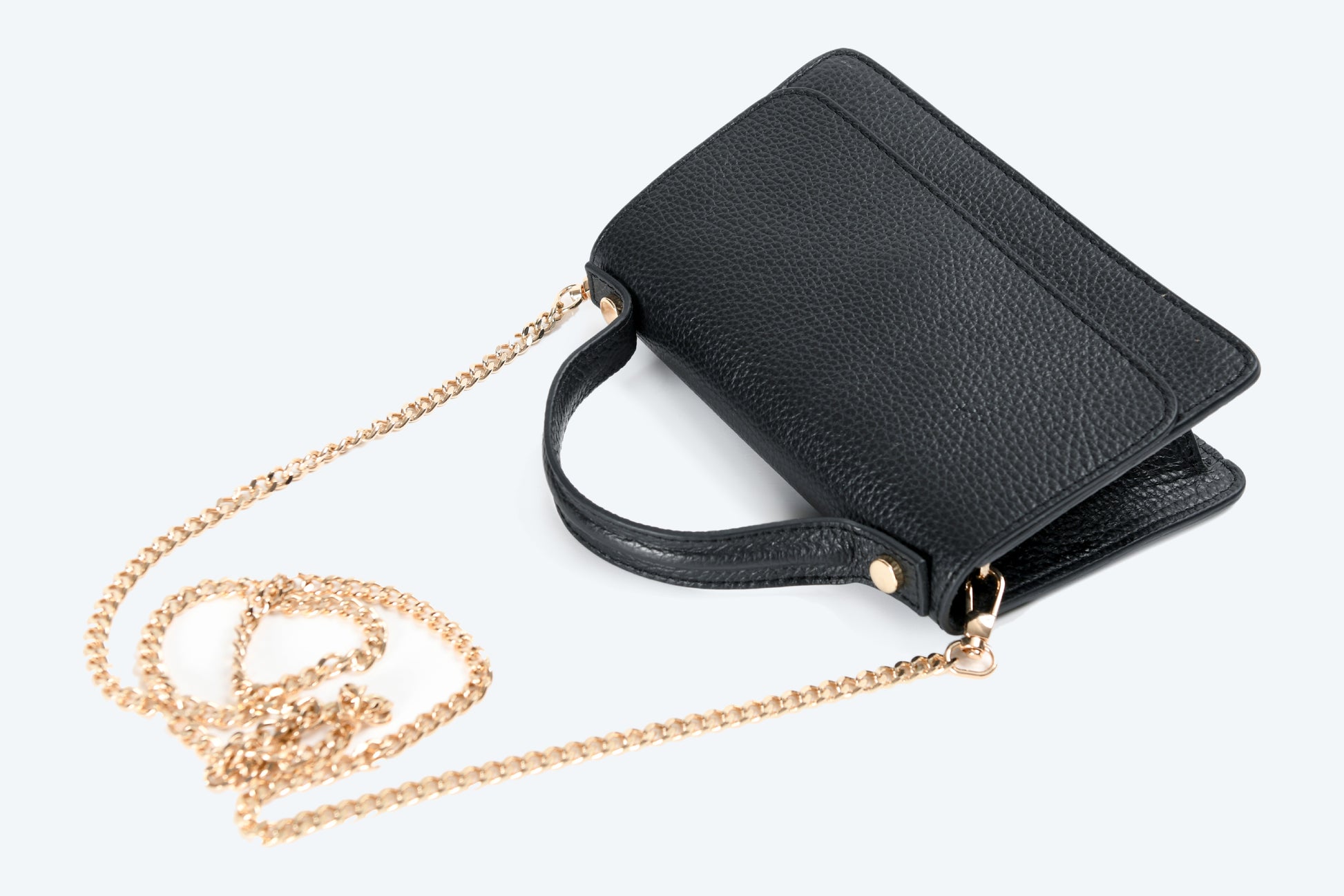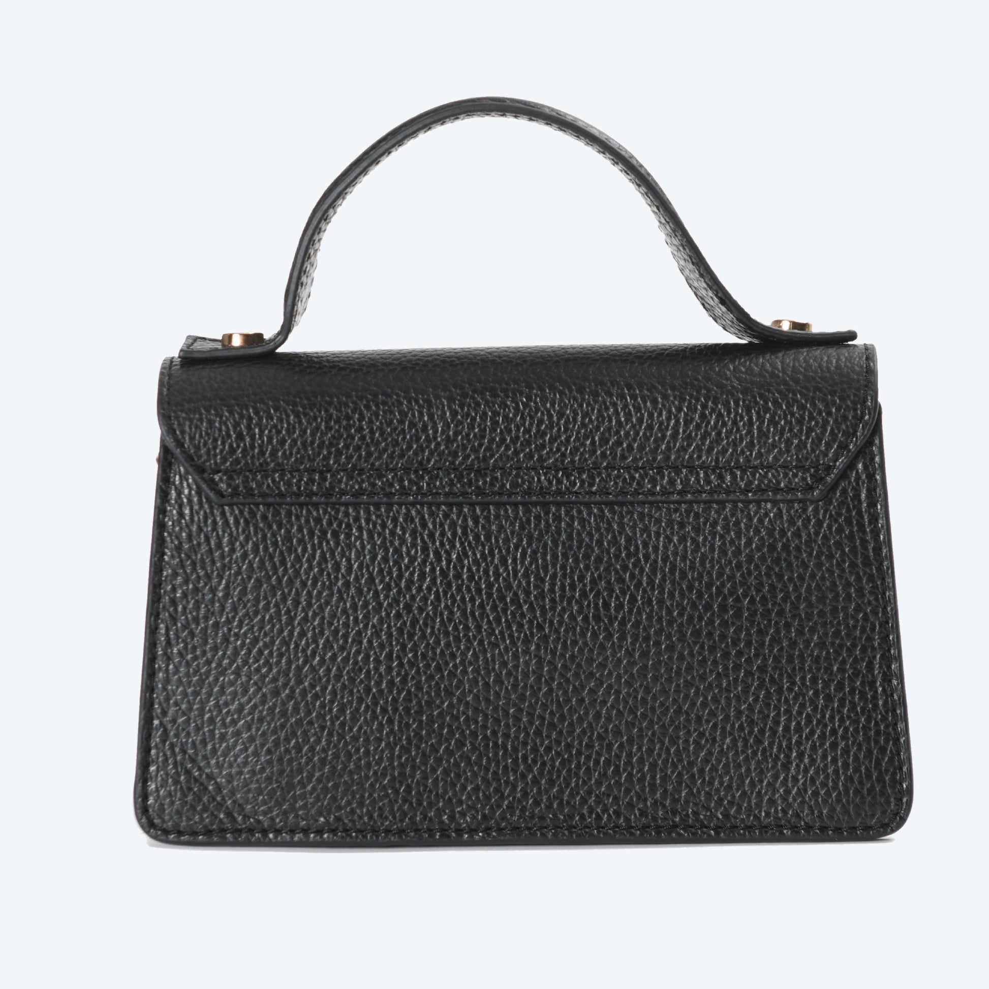 The interior is lined with soft textile fabric and offers just the right amount of space for your must-haves, while the magnetic closure ensures your belongings stay secure with ease. Its minimalist black leather exterior is enhanced by subtle gold accents, making it suitable for both casual outings and sophisticated evenings.