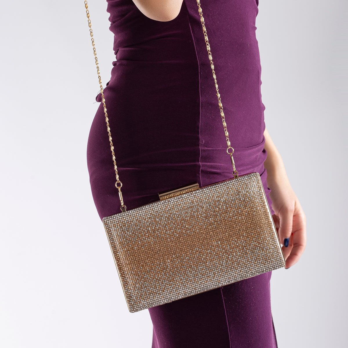 Enhance your evening and special occasion attire with this elegant small purse, designed with shimmering rose gold glitter.