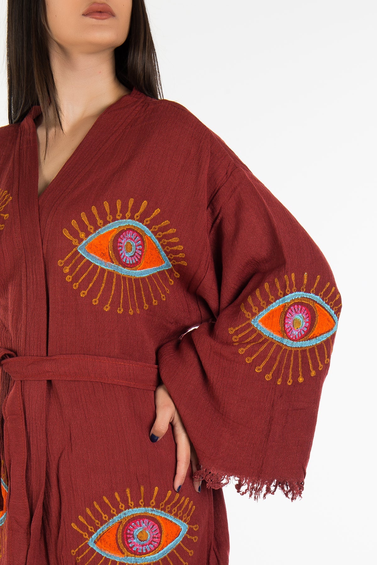 With eye-catching evil eye designs, this kimono isn’t just gorgeous; it’s your vibe booster, bringing positive energy and a touch of protection wherever you go. Whether you’re lounging at home, turning heads at a party, or rocking it as a beach cover-up, it’s the piece that says, “I’m here to make an impression.”
