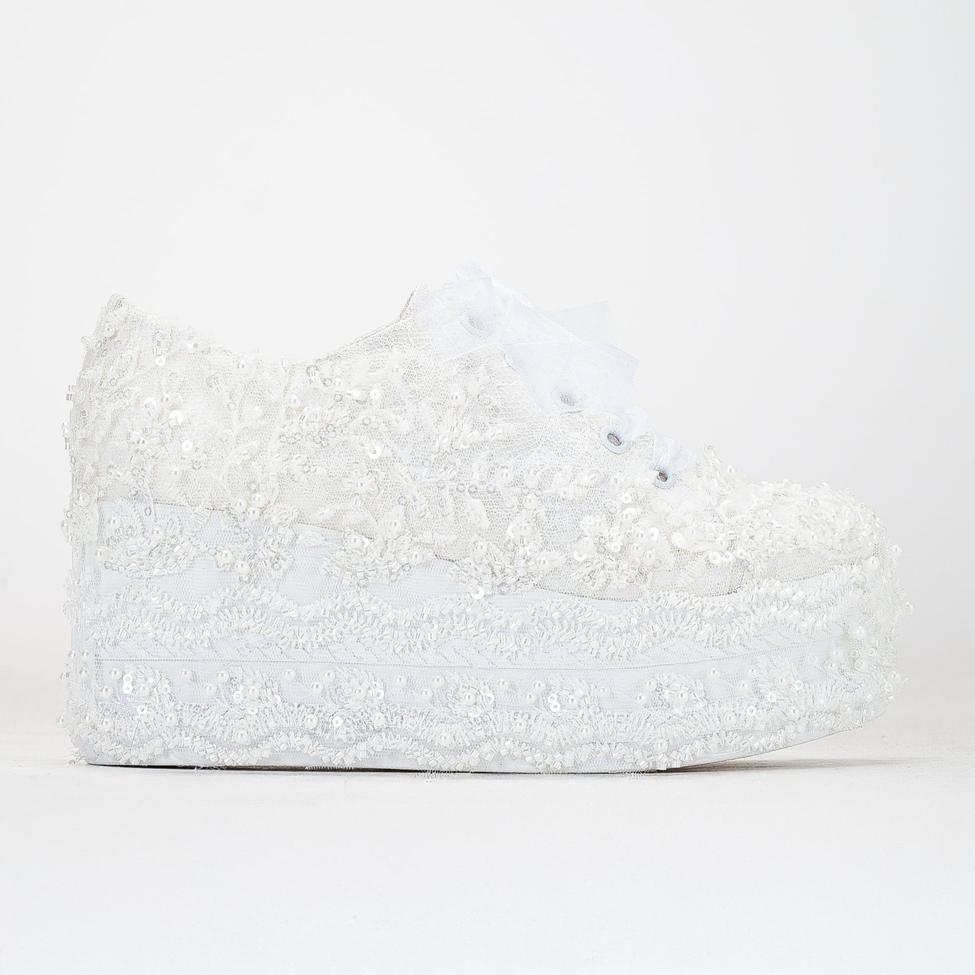 • These wedding sneakers feature a 2.7-inch outsole height (7 cm). The ivory-colored upper is adorned with meticulously handcrafted lace crochet details, adding an elegant touch to every step you take