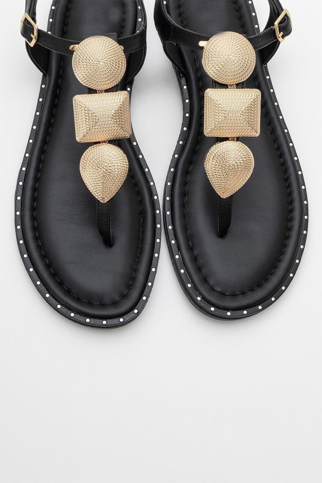 Handmade in Turkey, these flat sandals run true to size and feature a soft leather insole for breathable all-day wear. The refined thong silhouette is elevated with a striking gold buckle detail, adding a touch of shine and modern elegance to the minimalist design.